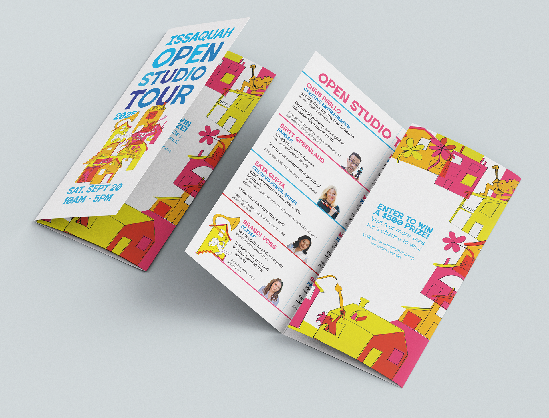 After discussing with my client, I determined the three main characteristics of the Issaquah Open Studio Tours were: Expressive, Welcoming, and Professional. Using these as my guides, I made three moodboards to express combinations of these characteristics, and three first drafts for my client to choose between.